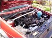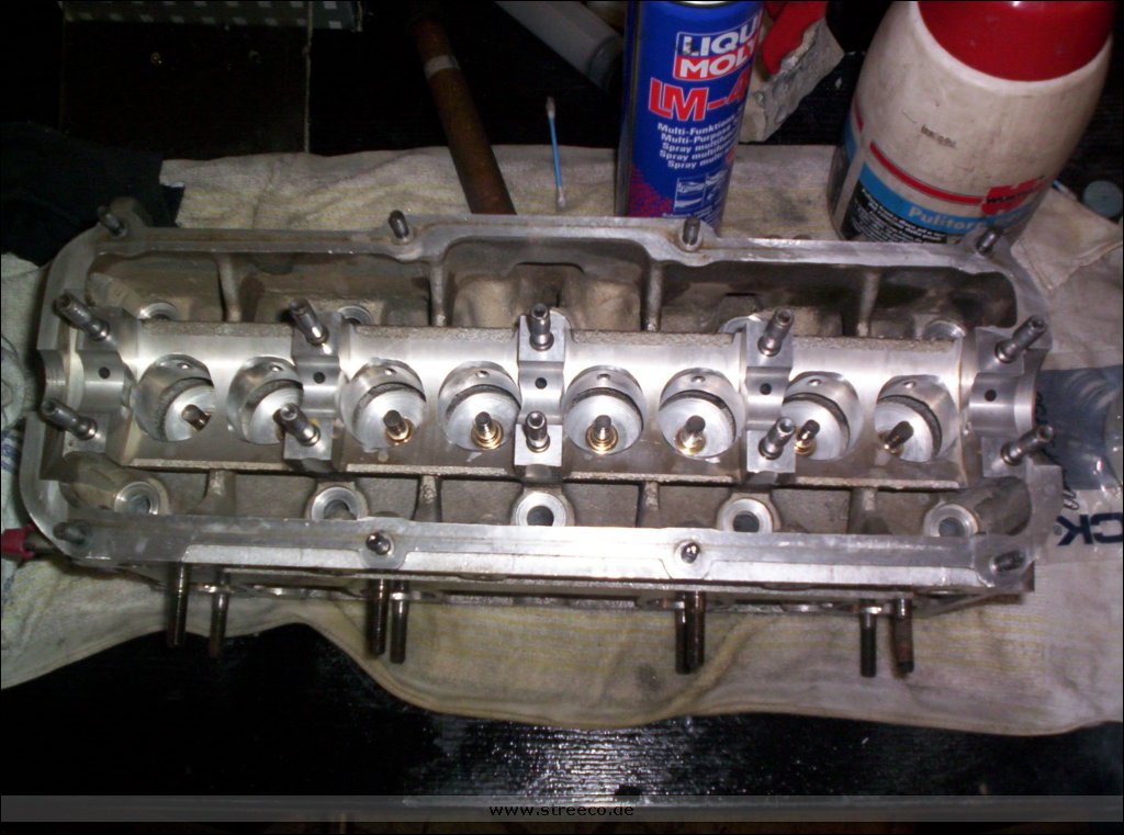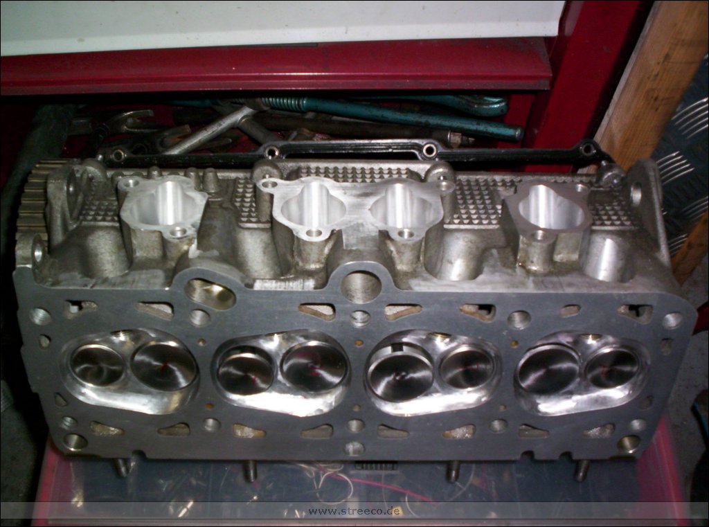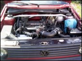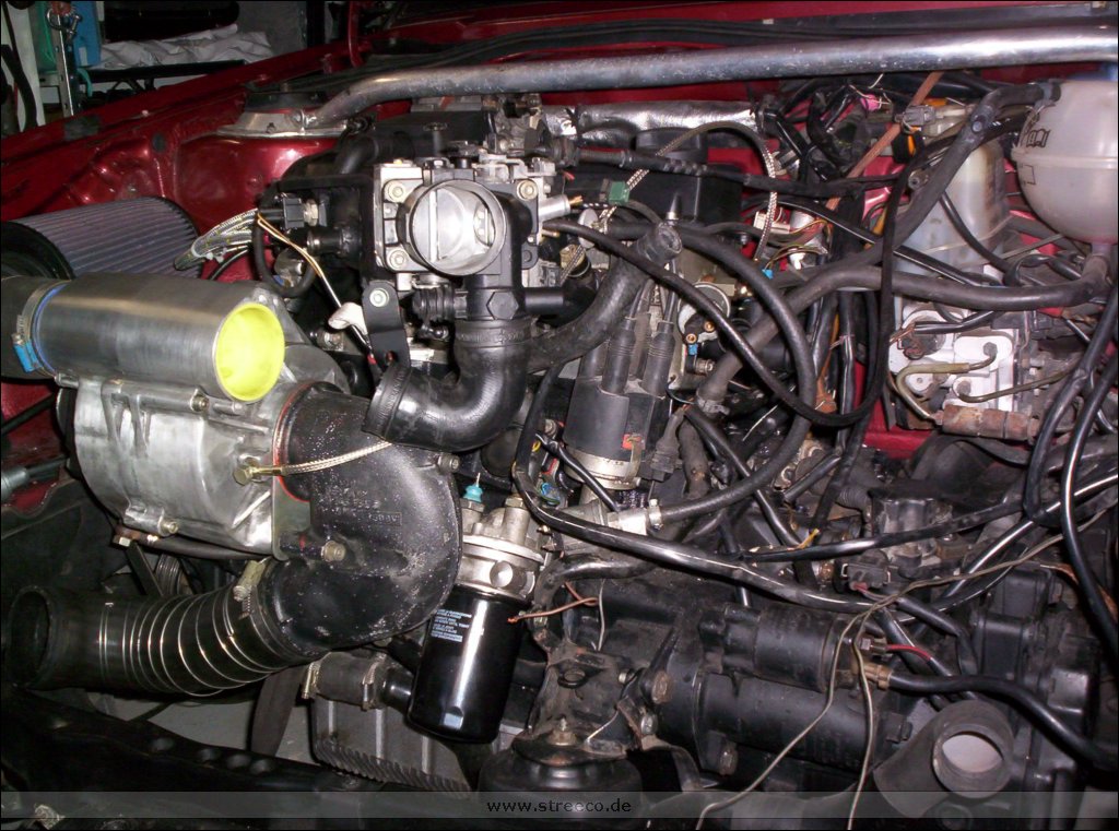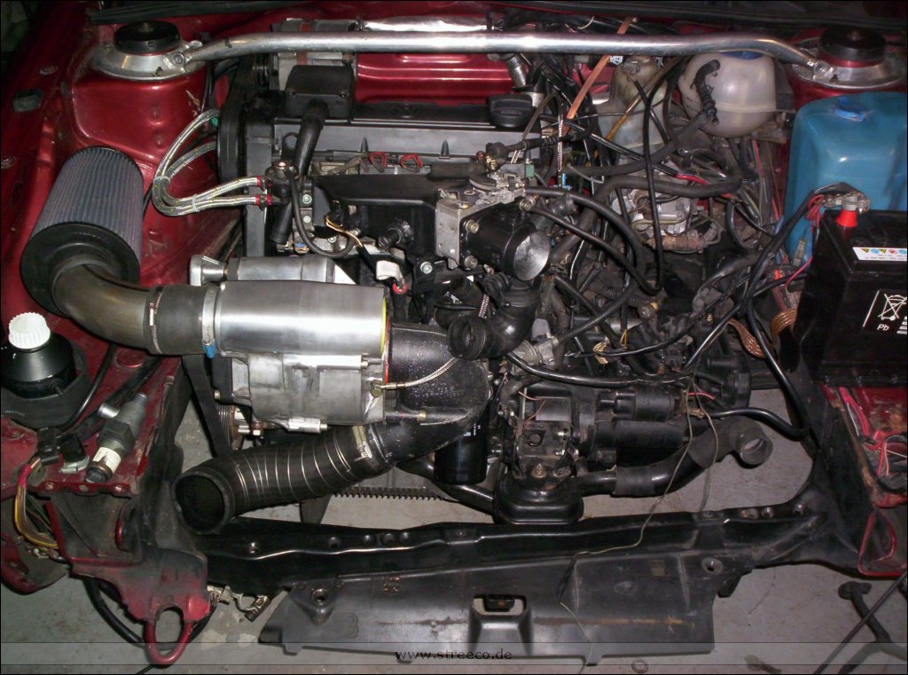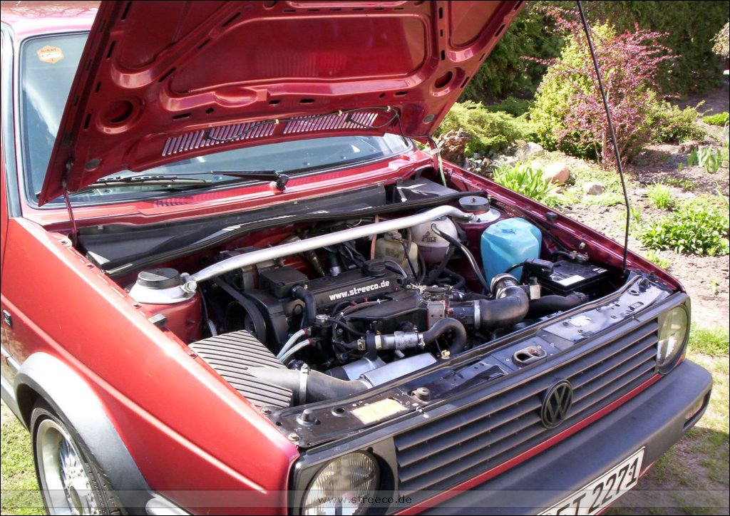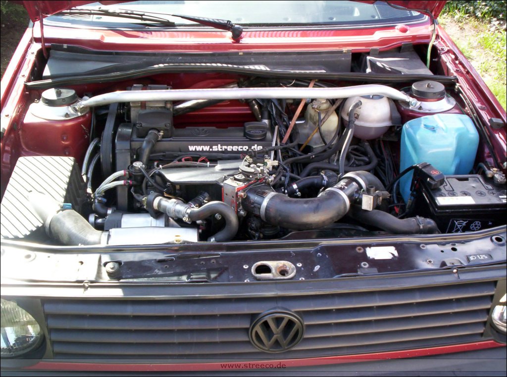 km mit den grossen 350ccm G60 E-Ventilen (grau) eingefahren, dann erfolgte eine Grobabstimmung mit E-Ventilen vom Audi RS2 (440ccm) mit 4 bar Benzindruckregler und einem LS-Cartec Datensatz, eine spezielle Abstimmung mit Porsche GT2 E-Ventilen ist in Planung, bei den Abstimmungsfahrten konnten die relevanten Motordaten wie Ladedruck, Ladelufttemperatur, Benzindruck, Abgastemperatur und Lambdawert (Breitbandlambda) über ein entspiegeltes Digitaldisplay in der Mittelkonsole kontrolliert werden, was die Abstimmungsfahrten erheblich erleichtert hat und teure Motorschäden vermeiden hilft eine Leistungsmessung auf dem nagelneuen Hofmann-Prüfstand der Firma GeParts in Storkow ergab 265 PS und 306 Nm mit dem vorläufigen Renn-Setup, also 62er Laderrad, offenem K&N-Pilz, ohne Kat mit sehr fetter Abstimmung, Bestzeiten Viertelmeile bislang 13.5 sec auf 173 km/h in Wittstock beim Test&Tune 2005, ZEITZETTEL und 13.4 sec auf 168 km/h beim VW Jam 2005 in Luckau, das leider stark verregnet war, bei beiden Veranstaltungen kamen an der Vorderachse 22.0x8.0x15 Mickey Thompson ET DRAG Slicks zum Einsatz, für den Strasseneinsatz wird